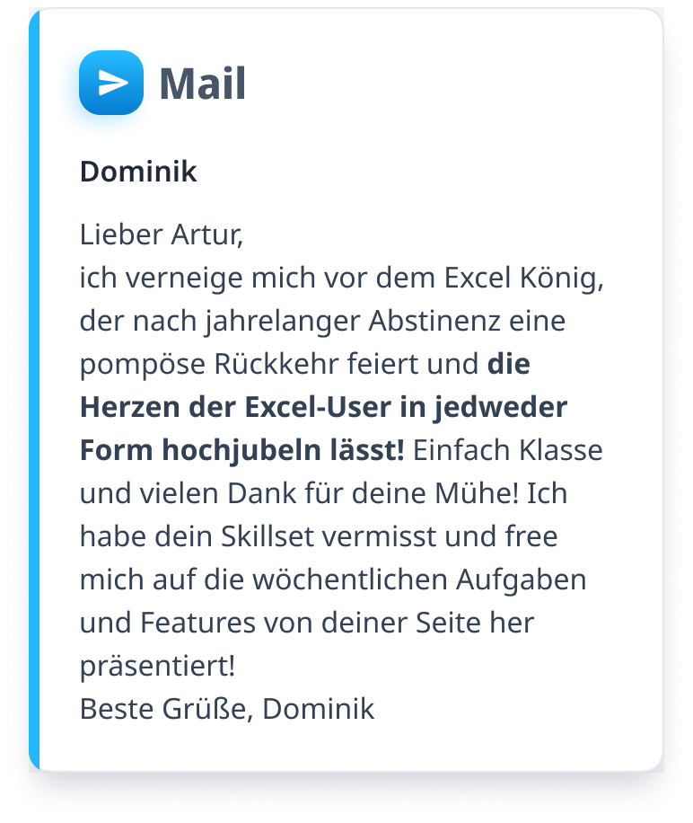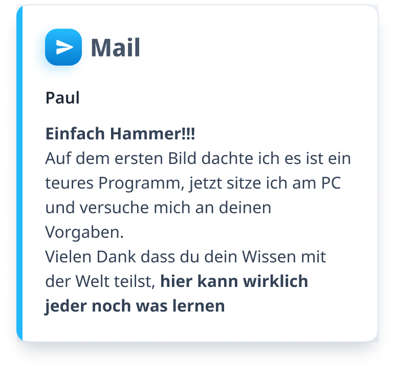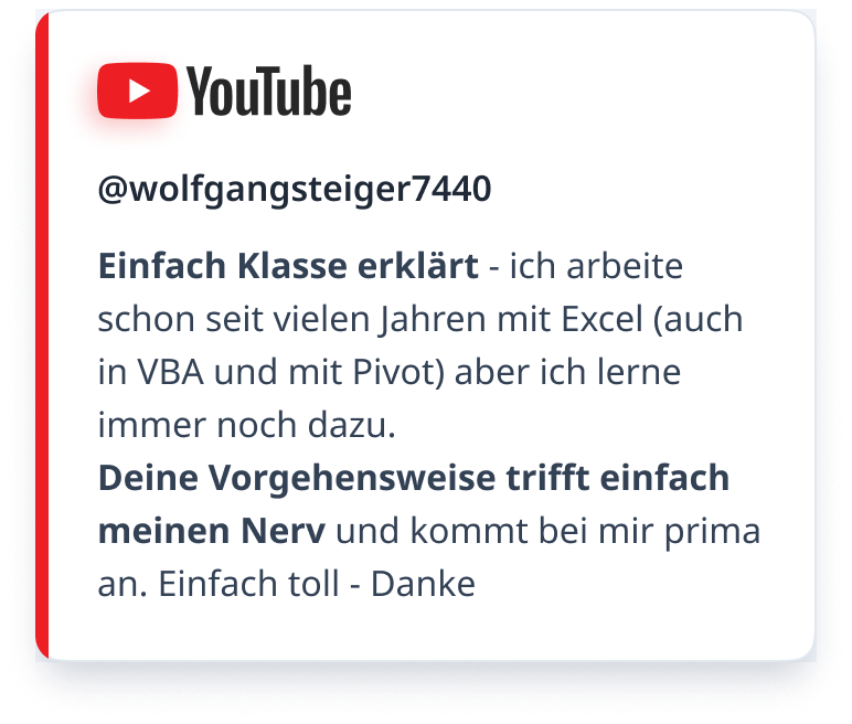 "Ich bin ja eigentlich kein Excel Fan, komme jedoch nicht herum monatlich meine Reports zu erstellen. Mit den Power Query Techniken aus dem Kurs konnte ich nun meine Excel Zeit endlich auf das Minimum reduzieren und gleichzeitig meine Reports interaktiv gestalten. Mein Chef freute sich auch :)"