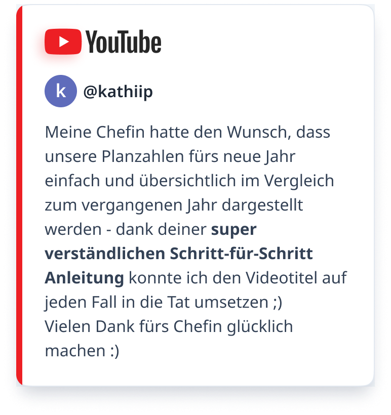 "Lange habe ich schon mit dem Gedanken gespielt meine Excel Vorlagen neu zu gestalten, jedoch fehlte mir wirklich das Konzept. Die Vorlagen vom Kurs habe ich als Basis für meine neuen Templates verwendet und dann für mich angepasst. Es funktioniert nun hervorragend!"